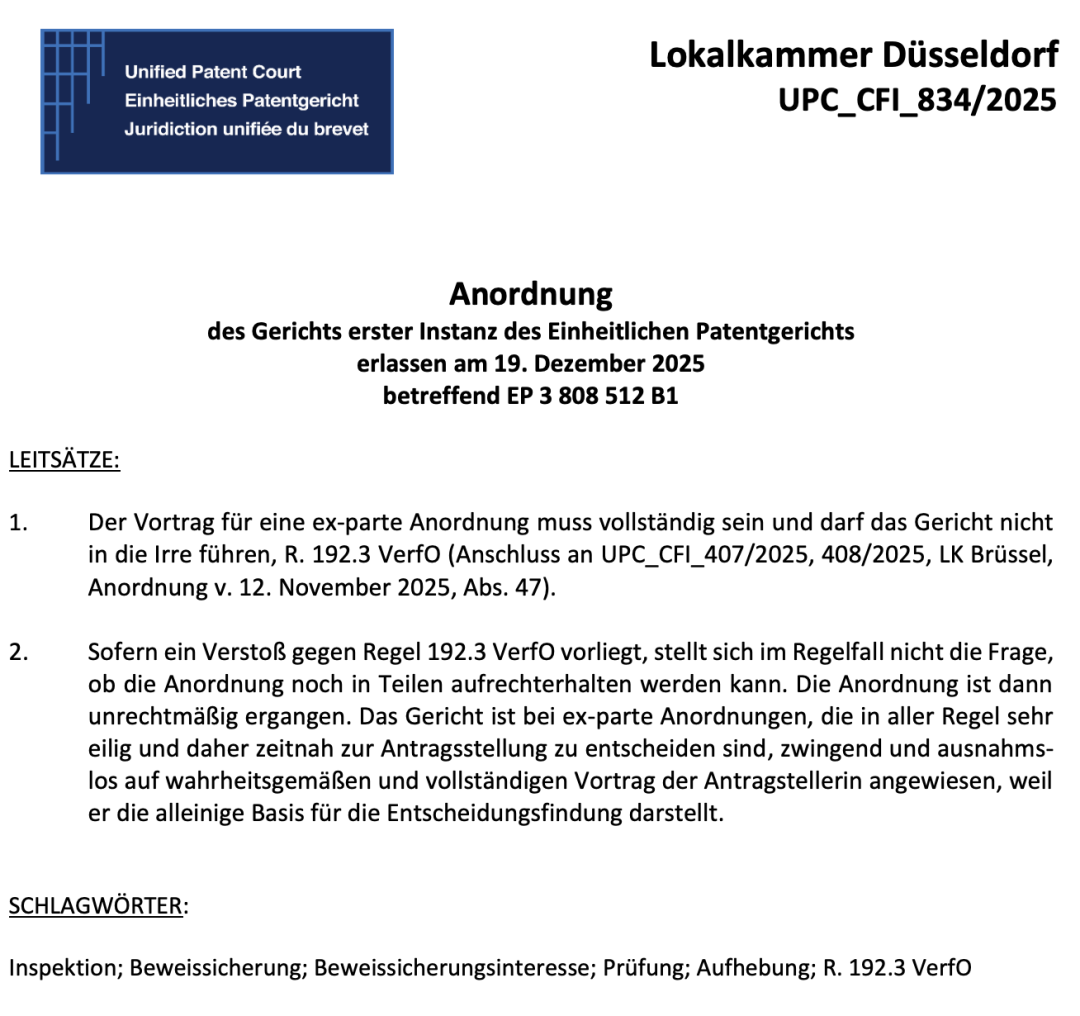 最终结果是,2025年12月19日UPC杜塞尔多夫地方分院作出裁定,认定原命令是基于“违法作出的”,因此撤销了该单方证据保全命令。